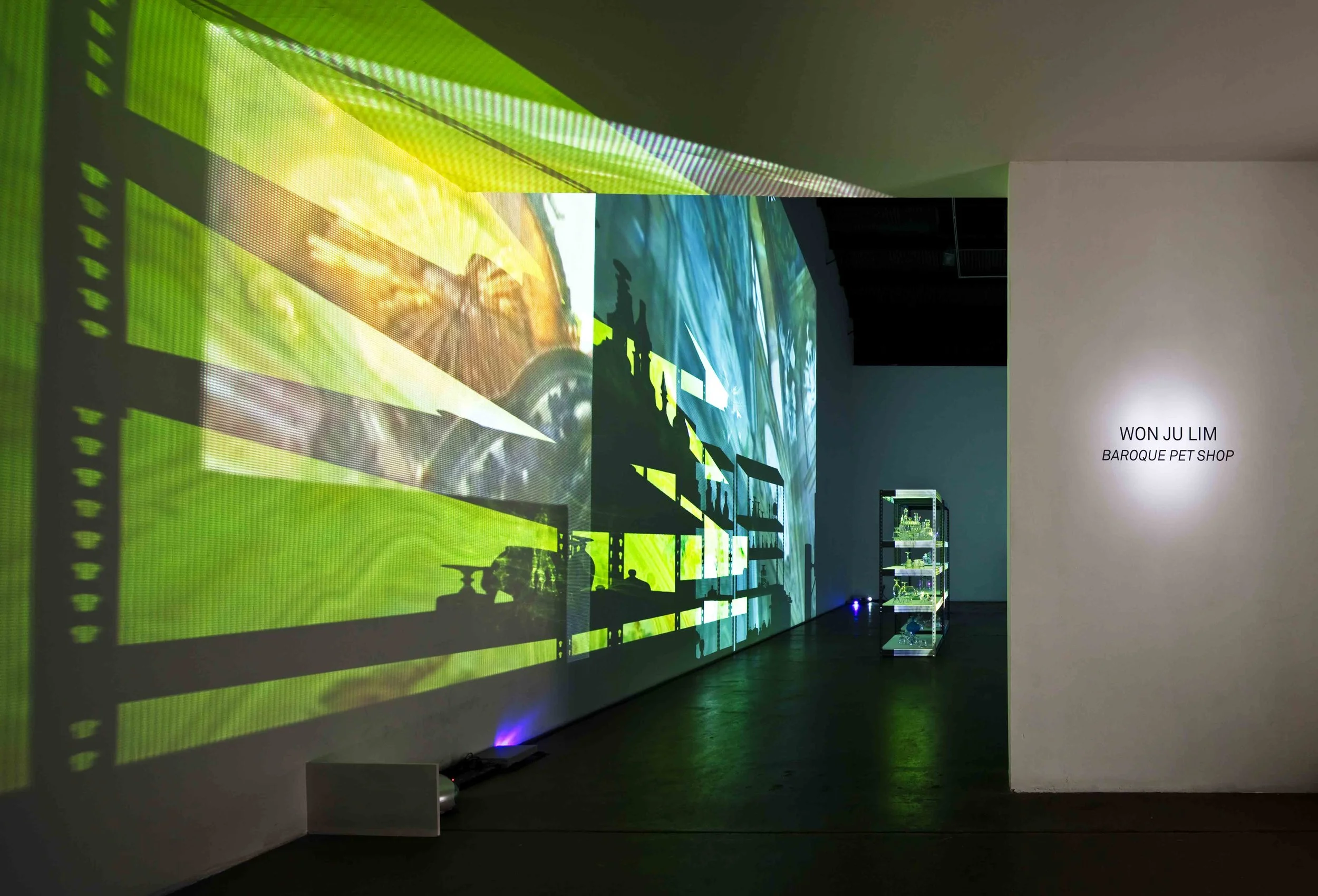 Mixed media sculptures, 5 video projections (3 revolving projections)